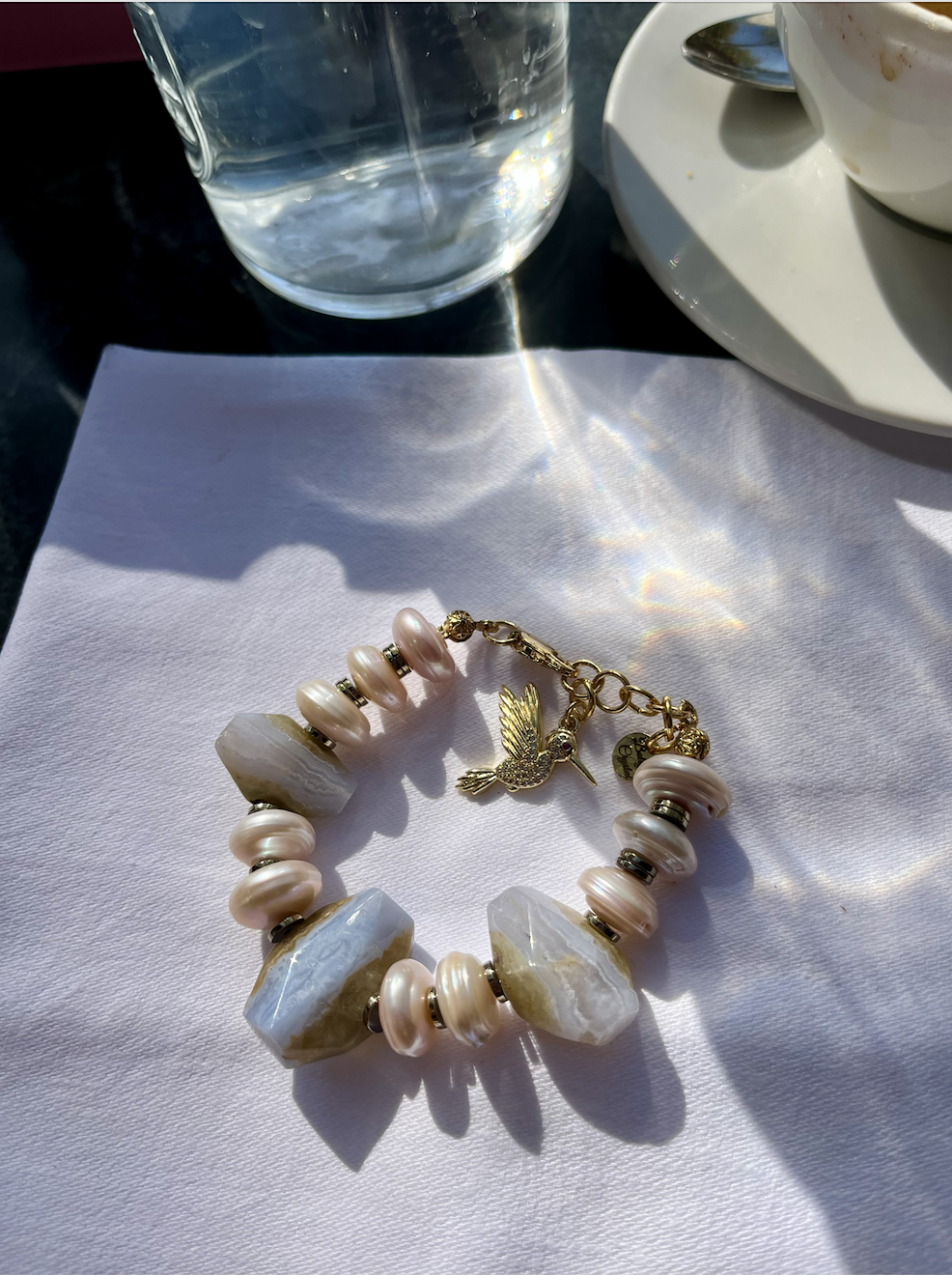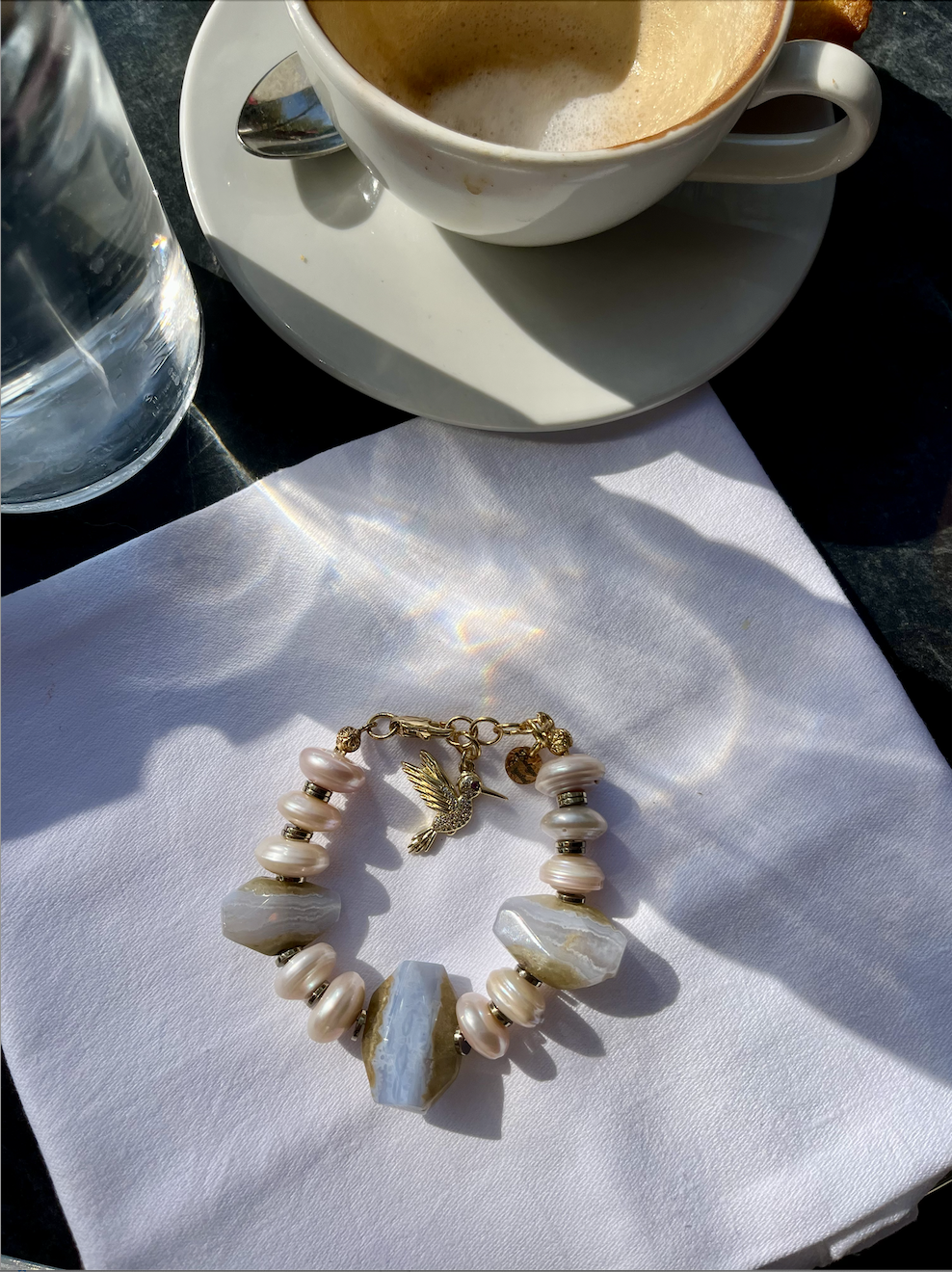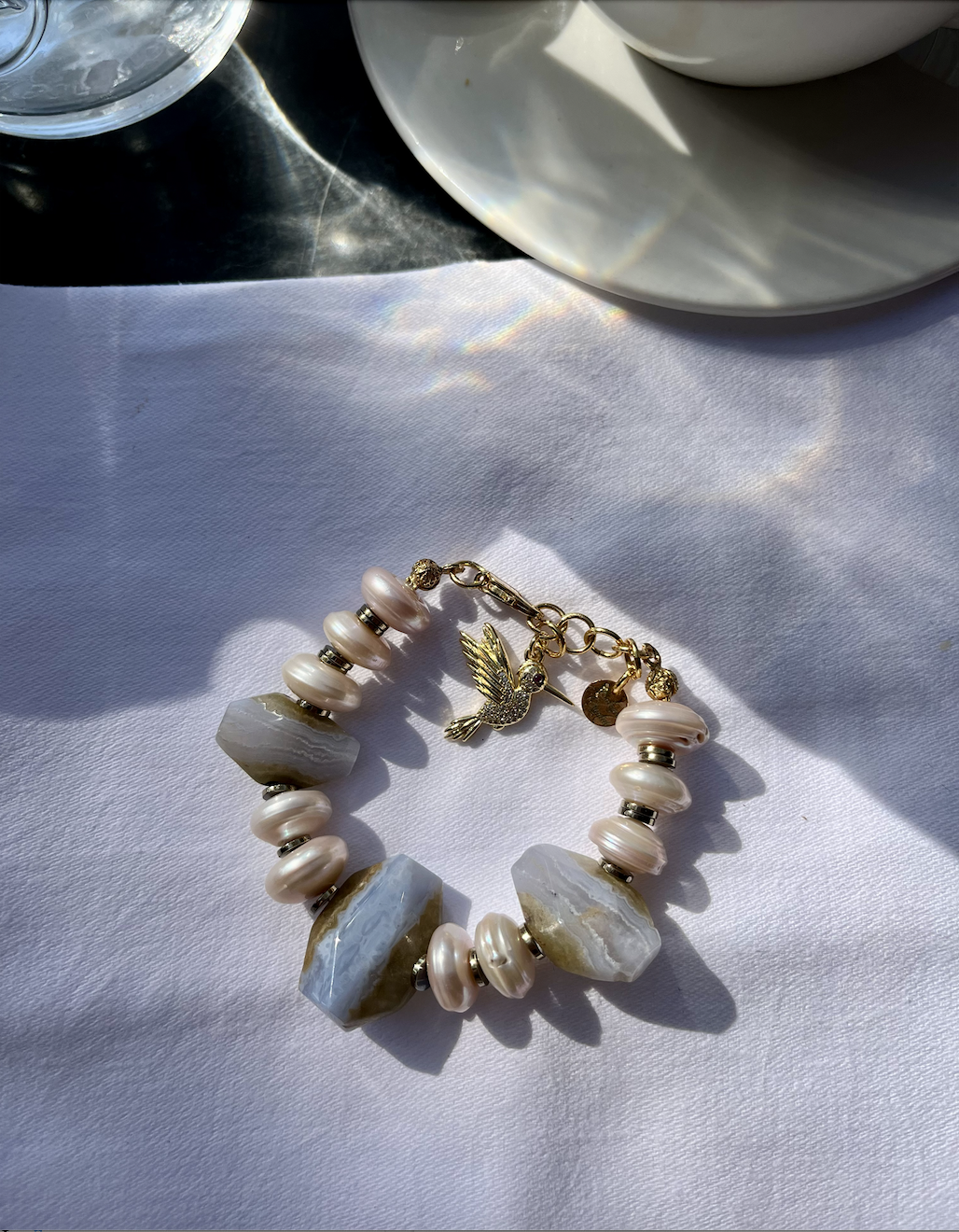 Alaycı kuş, çevresindeki sesleri duyar, öğrenir ve sonunda hepsini kendi melodisine dönüştürür. Çok sesliliği, uyumu ve kendi sesini bulmayı simgeler. Öğrendiklerini taklit ederek başlar, sonra hepsini kendine özgü bir melodide birleştirir. Tasarımda kullanılan “Alaycı Kuş”, sesini bulmak ve ona sahip çıkmak isteyenler için tasarlandı. Mavi kalsedon, düşünceyi yumuşak bir açıklığa taşırken; inci, sezgiyi ve kalbin zarafetini bileğinde onu taşıyana hatırlatır.