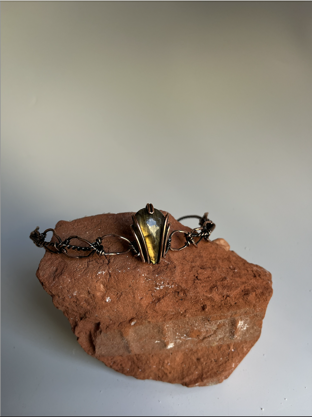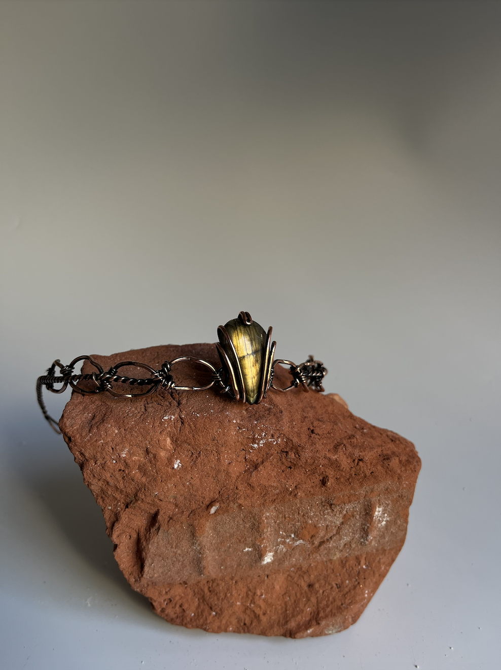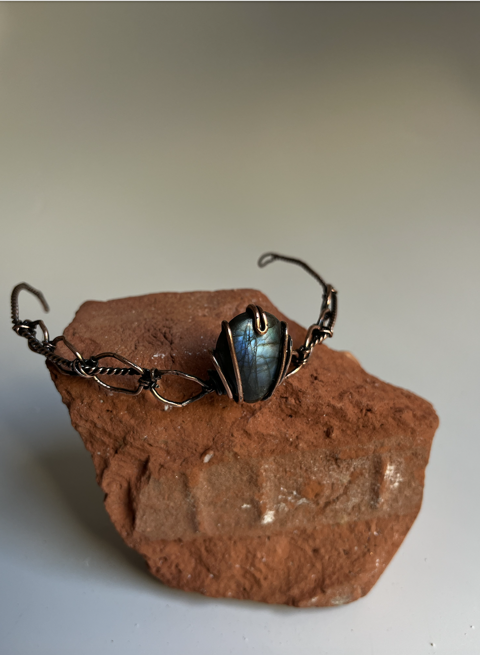 Saç tacımız, tamamen saf bakır tel sarma tekniği ve el işçiliği ile ortaya çıkmıştır. Bakır; enerjiyi ileten, şifayı güçlendiren ve taşın doğal titreşimini bedenle uyumlu hale getiren bir metal olarak tercih edilmiştir. Bu nedenle yalnızca estetik değil, aynı zamanda spiritüel bir bütünlük sunar.