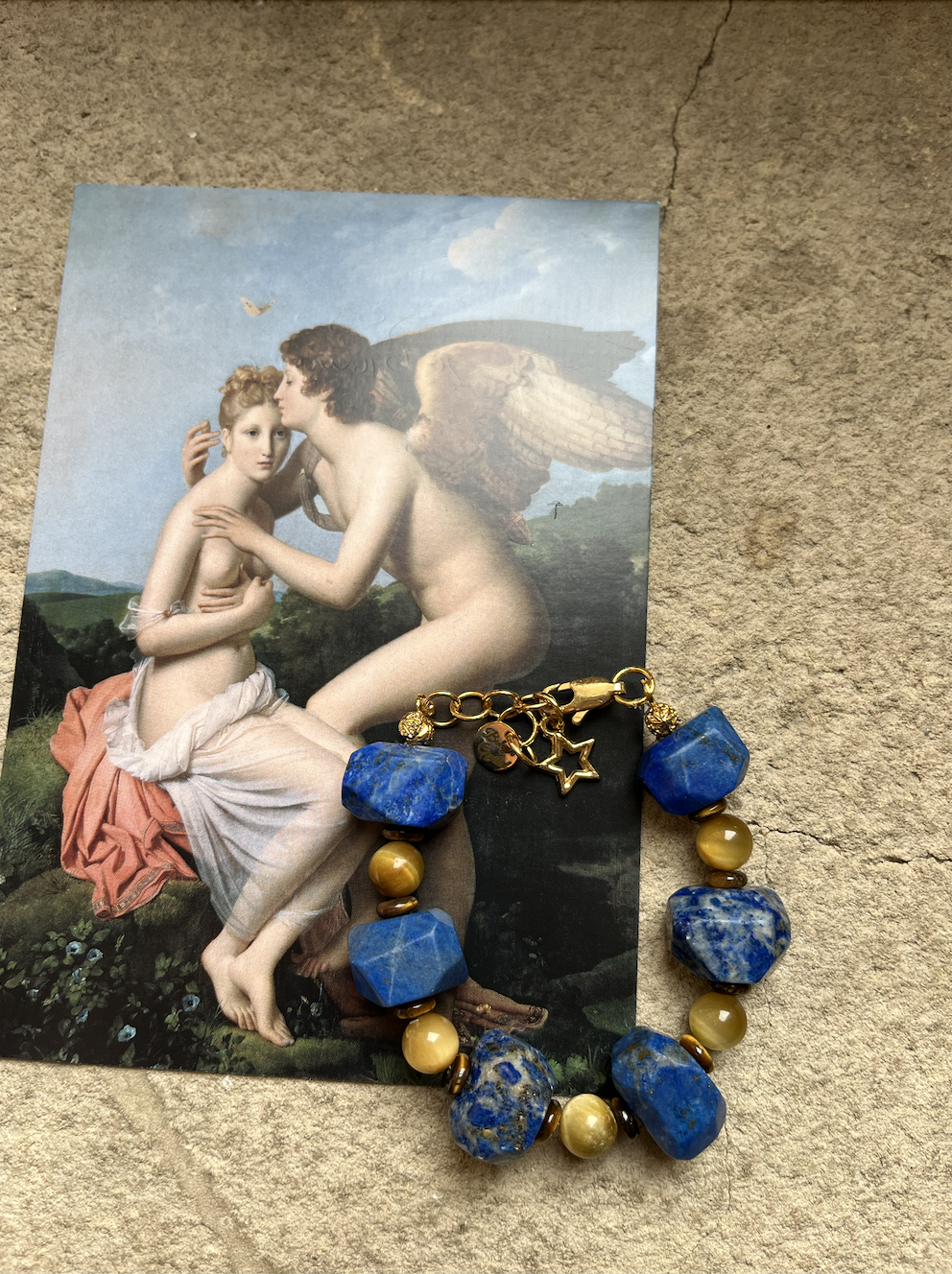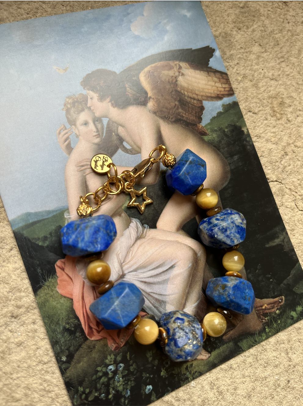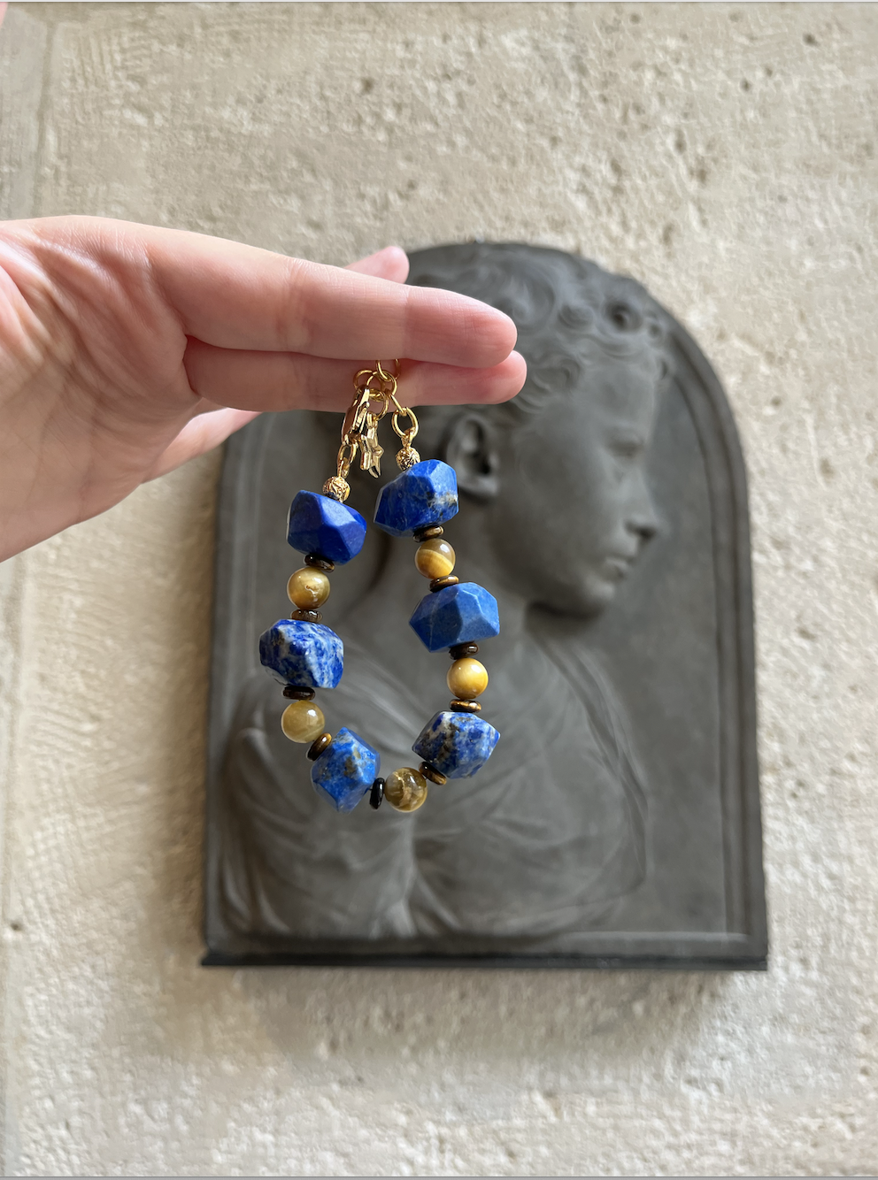 Lapis Lazuli aynı zamanda boğaz çakrasını da dengeler. Bu çakra, kendini açıkça ifade edebilme, hakikati dile getirme ve içsel sesini duyurma ile ilgilidir. Lapis’i taşıyan kişinin iletişim becerileri güçlenir, korkmadan konuşabilme ve sınır koyma kapasitesi artar. Özellikle bastırılmış duyguların serbest bırakılmasında ve doğru kelimeleri bulmakta zorlanan kişilerde büyük destek sağlar. Bu durumu güçlendirmek amaçlı lapis lazuli aralarına cesaretin ve gücün taşı olan minik kaplangözleri kullanılmıştır. Doğru, cesur ve etkileyici kelimeler kullanmak isteyen ve bunu bir ifade sanatına dönüştürmek isteyen herkes için son derece uygun bir tercih olacaktır. Lapis Lazuli, aynı zamanda Sümer mitolojisinde Ianna’nın kutsal taşı olarak da kabul edilmiştir. Derin mavi rengi ile alakalı tarihi detayları aşağıda sizler için anlattık.
