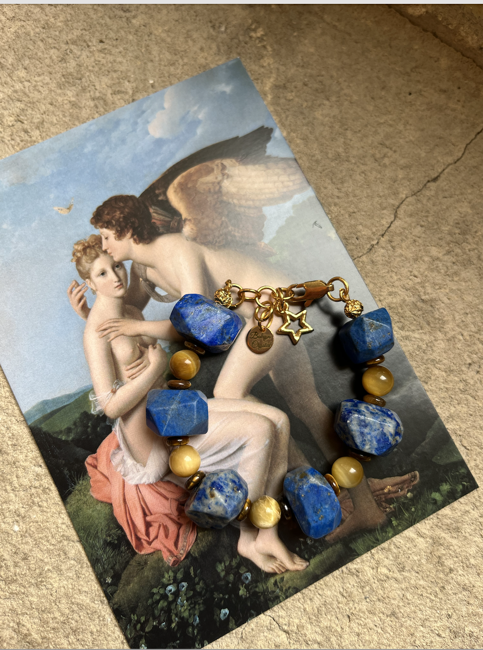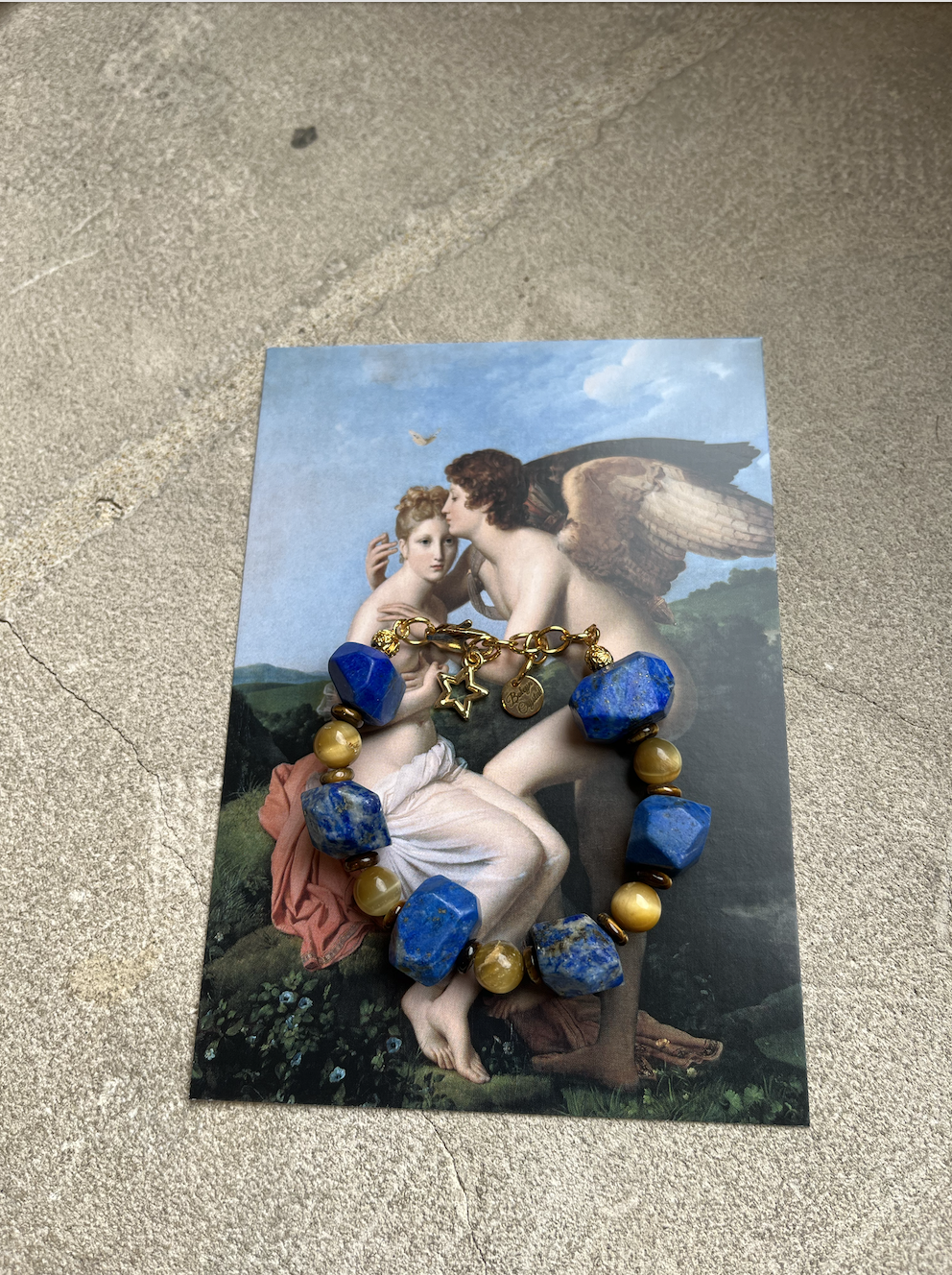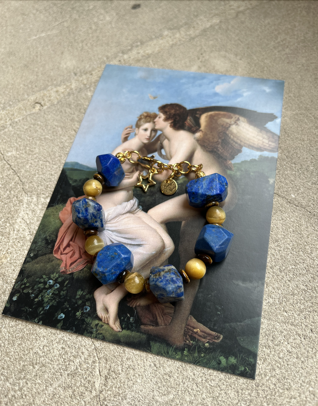 Lapis Lazuli aynı zamanda boğaz çakrasını da dengeler. Bu çakra, kendini açıkça ifade edebilme, hakikati dile getirme ve içsel sesini duyurma ile ilgilidir. Lapis’i taşıyan kişinin iletişim becerileri güçlenir, korkmadan konuşabilme ve sınır koyma kapasitesi artar. Özellikle bastırılmış duyguların serbest bırakılmasında ve doğru kelimeleri bulmakta zorlanan kişilerde büyük destek sağlar. Bu durumu güçlendirmek amaçlı lapis lazuli aralarına cesaretin ve gücün taşı olan minik kaplangözleri kullanılmıştır. Doğru, cesur ve etkileyici kelimeler kullanmak isteyen ve bunu bir ifade sanatına dönüştürmek isteyen herkes için son derece uygun bir tercih olacaktır. Lapis Lazuli, aynı zamanda Sümer mitolojisinde Ianna’nın kutsal taşı olarak da kabul edilmiştir. Derin mavi rengi ile alakalı tarihi detayları aşağıda sizler için anlattık.